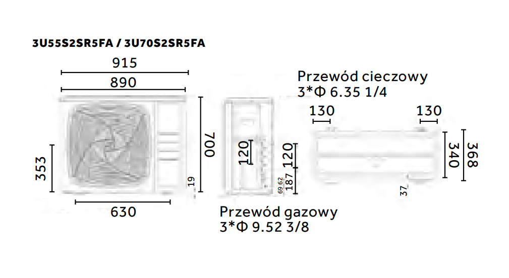 | Wymiary, jednostka zewnętrzna, [s × g × w], [mm]: | 890 x 340 x 700 |