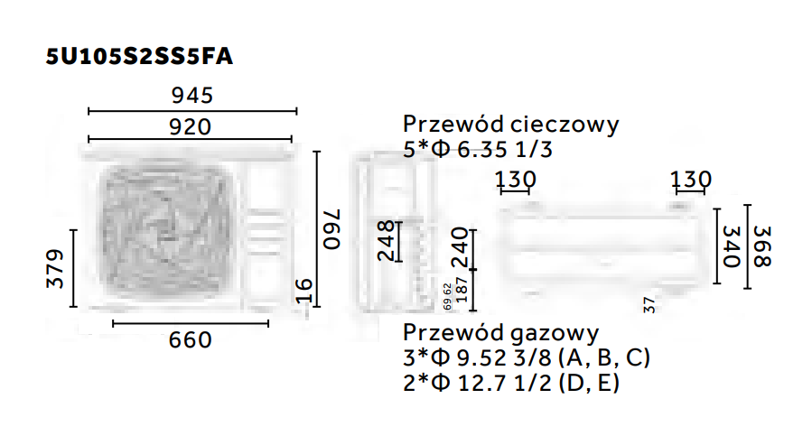 | Wymiary, jednostka zewnętrzna, [s × g × w], [mm]: | 920 x 372 x 760 |