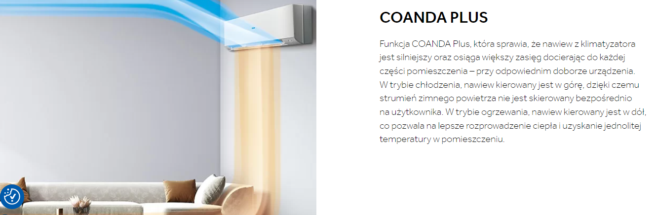 Funkcja COANDA Plus, która sprawia, że nawiew z klimatyzatora jest silniejszy oraz osiąga większy zasięg docierając do każdej części pomieszczenia – przy odpowiednim doborze urządzenia. W trybie chłodzenia, nawiew kierowany jest w górę, dzięki czemu strumień zimnego powietrza nie jest skierowany bezpośrednio na użytkownika. W trybie ogrzewania, nawiew kierowany jest w dół, co pozwala na lepsze rozprowadzenie ciepła i uzyskanie jednolitej temperatury w pomieszczeniu.