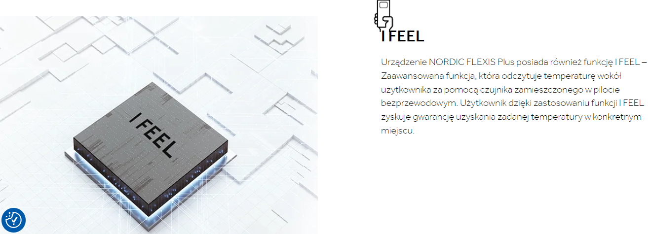 Urządzenie NORDIC FLEXIS Plus posiada również funkcję I FEEL – Zaawansowana funkcja, która odczytuje temperaturę wokół użytkownika za pomocą czujnika zamieszczonego w pilocie bezprzewodowym. Użytkownik dzięki zastosowaniu funkcji I FEEL zyskuje gwarancję uzyskania zadanej temperatury w konkretnym miejscu.