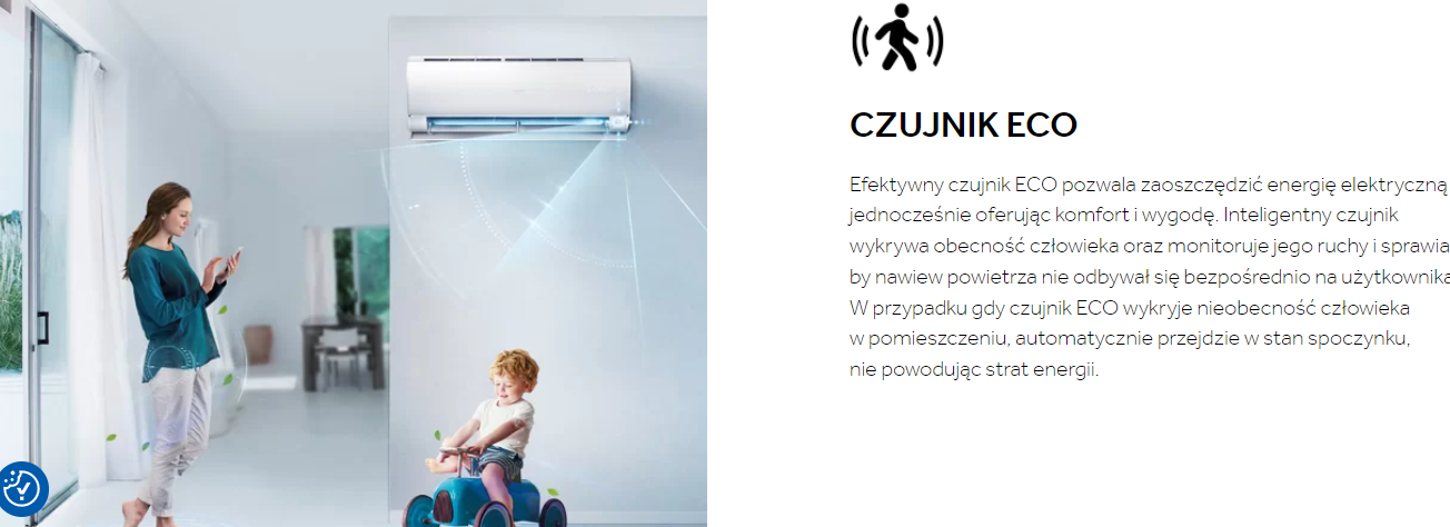 Efektywny czujnik ECO pozwala zaoszczędzić energię elektryczną jednocześnie oferując komfort i wygodę. Inteligentny czujnik wykrywa obecność człowieka oraz monitoruje jego ruchy i sprawia by nawiew powietrza nie odbywał się bezpośrednio na użytkownika. W przypadku gdy czujnik ECO wykryje nieobecność człowieka w pomieszczeniu, automatycznie przejdzie w stan spoczynku, nie powodując strat energii.