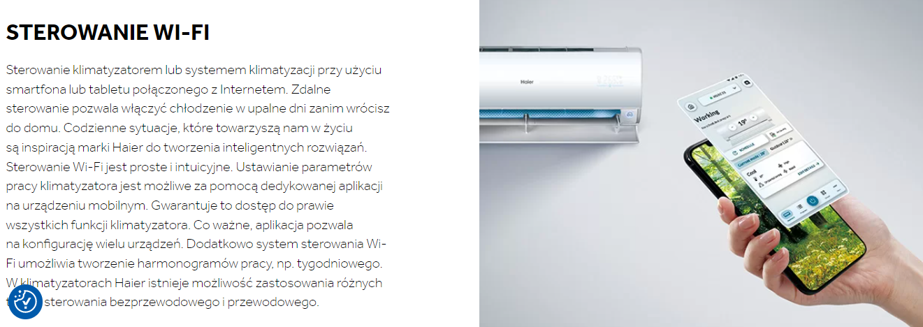 Sterowanie klimatyzatorem lub systemem klimatyzacji przy użyciu smartfona lub tabletu połączonego z Internetem. Zdalne sterowanie pozwala włączyć chłodzenie w upalne dni zanim wrócisz do domu. Codzienne sytuacje, które towarzyszą nam w życiu są inspiracją marki Haier do tworzenia inteligentnych rozwiązań. Sterowanie Wi-Fi jest proste i intuicyjne. Ustawianie parametrów pracy klimatyzatora jest możliwe za pomocą dedykowanej aplikacji na urządzeniu mobilnym. Gwarantuje to dostęp do prawie wszystkich funkcji klimatyzatora. Co ważne, aplikacja pozwala na konfigurację wielu urządzeń. Dodatkowo system sterowania Wi-Fi umożliwia tworzenie harmonogramów pracy, np. tygodniowego. W klimatyzatorach Haier istnieje możliwość zastosowania różnych typów sterowania bezprzewodowego i przewodowego.