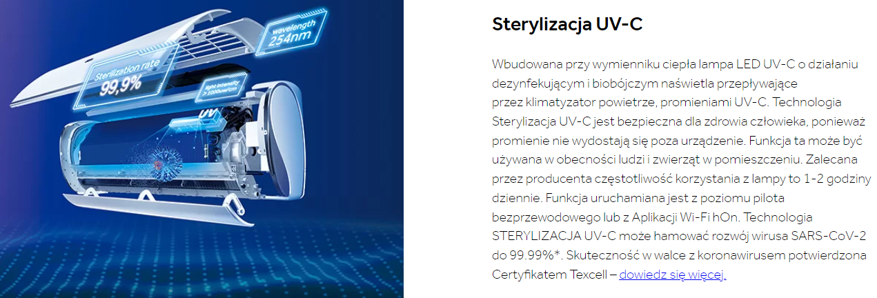 Wbudowana przy wymienniku ciepła lampa LED UV-C o działaniu dezynfekującym i biobójczym naświetla przepływające przez klimatyzator powietrze, promieniami UV-C. Technologia Sterylizacja UV-C jest bezpieczna dla zdrowia człowieka, ponieważ promienie nie wydostają się poza urządzenie. Funkcja ta może być używana w obecności ludzi i zwierząt w pomieszczeniu. Zalecana przez producenta częstotliwość korzystania z lampy to 1-2 godziny dziennie. Funkcja uruchamiana jest z poziomu pilota bezprzewodowego lub z Aplikacji Wi-Fi hOn. Technologia STERYLIZACJA UV-C może hamować rozwój wirusa SARS-CoV-2 do 99.99%*. Skuteczność w walce z koronawirusem potwierdzona Certyfikatem Texcell