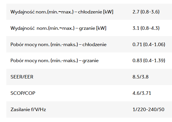 | Wydajność chł/grz, [kW]: | 2,7 (0,8-3,6) / 3,1 (0,8-4,3) |