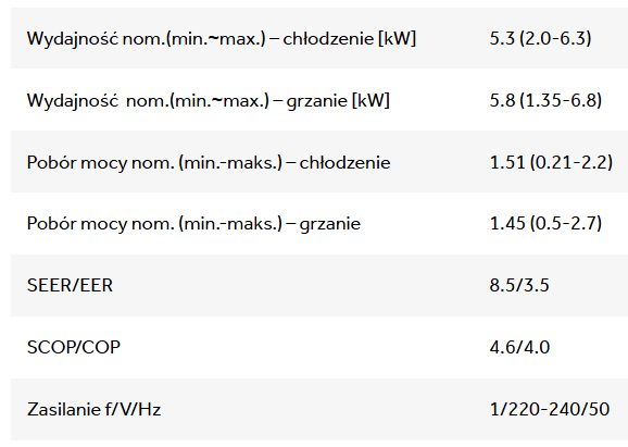 | Wydajność chł/grz, [kW]: | 5,3 (2,0-6,3) / 5,8 (1,35-6,8) |
