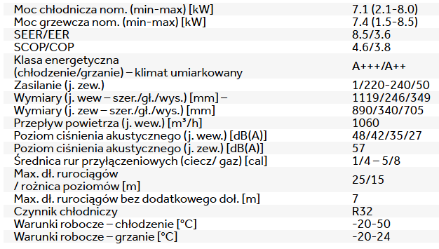 | Wydajność chł/grz, [kW]: | 7,1 (2,1-8,0) / 7,4 (1,5-8,5) |