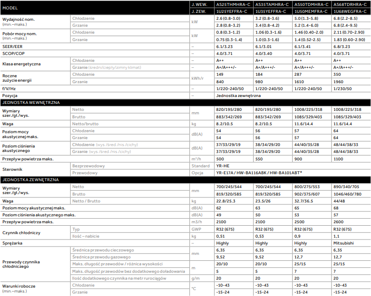| Zakres temperatur otoczenia dla pracy urządzenia w trybie grzania: | -15 – 24 °C |